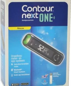 | Verpakkingsinhoud | Contour, Next, ONE, glucosemeter<br/>, 10, Contour, Next, teststrips<br/>, Microlet, Next, prikapparaat<br/>, 10, Microlet, gekleurde, lancetten<br/>, Etui<br/>, Handleiding, (Nederlands)<br/>, Downloadinstructies, voor, de, Contour, diabetes, app |