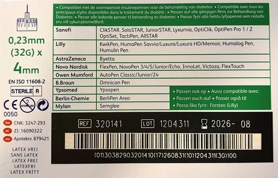| Verpakkingsinhoud | 100, insuline, pen, naaldjes, 4, mm |