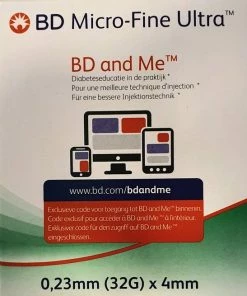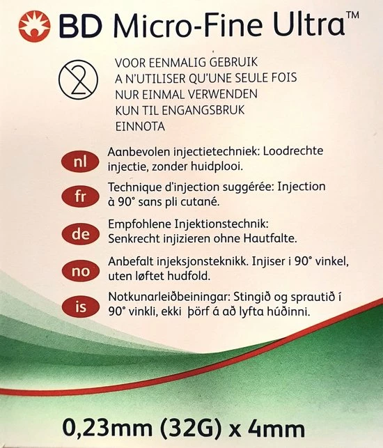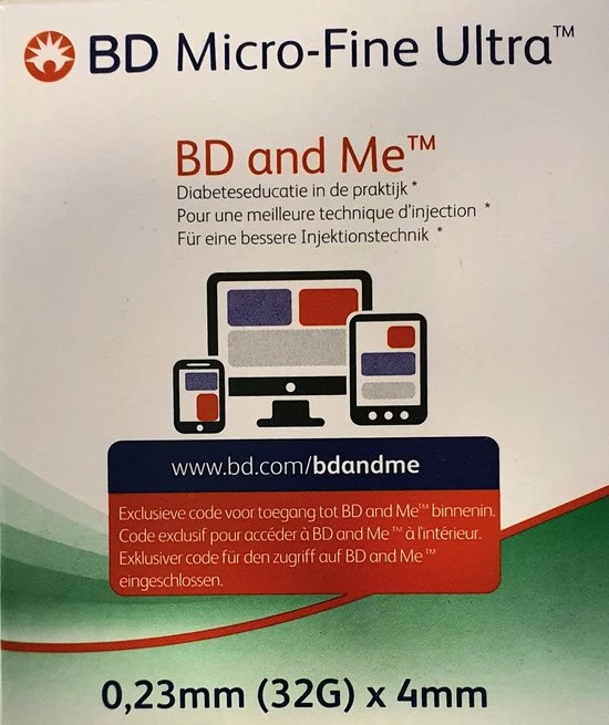 BD (Becton & Dickinson) Micro-Fine pennaalden voor het toedienen van insuline via uw insulinepen. Geschikt voor de insulinepennen van Novo Nordisk, Sanofi-Aventis, Eli Lilly, Owen Mumford, B.Braun en Ypsomed. Ze passen ook op de Byetta pen van Eli Lilly en de Victoza pen van Novo Nordisk. Alle BD Micro-Fine+ pennaalden zijn gemaakt volgens de Thinwall technologie. Dit geeft een grotere binnendiameter wat resulteert in een betere insulinedoorstroming en een verminderde drukkracht bij de injectie. Dus meer comfort!BD artikelnummer 320141Verpakt per 100 stuksAfmeting: 0,23x4mm 32GGeschikt voor verschillende insulinepennen