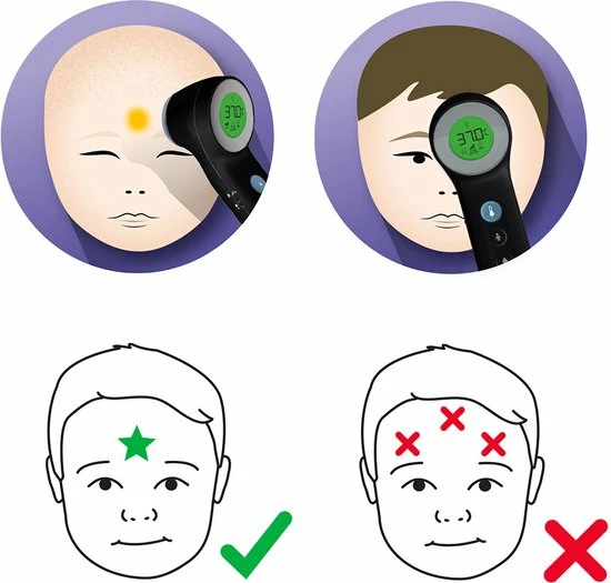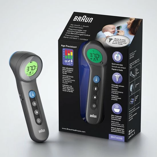 Met deze no touch digitale thermometer van Braun meet je de temperatuur van je baby vanaf een afstand door deze voor het voorhoofd te houden. Deze no touch thermometer is tevens voorzien van age precision waarbij er kleurcodes worden getoond per leeftijdscategorie vanaf 0-3 maanden tot boven de 3 jaar, de display toont dan groen bij een juiste tempertauur en rood bij verhoging wat voor kinderen van 0-3 maanden anders is dan peuters en kleuters. Uiteraard toont de thermometer ook de graden en is deze ook handig om te gebruiken om de temperatuur van het badwater te meten of het avondeten dan weet je zeker dat het de juiste tempepartuur heeft wat zeker in het begin best lastig kan zijn. Kortom een veilige, hygiënisch en praktische thermometer voor de hele familie. Braun is het merk dat het meest gebruikt wordt door artsen.