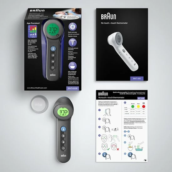 | Verpakkingsinhoud | 1x, Braun, ThermoScan, BNT400B, 1x, Beschermkapje, 2x, AAA, alkaline, batterij |