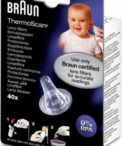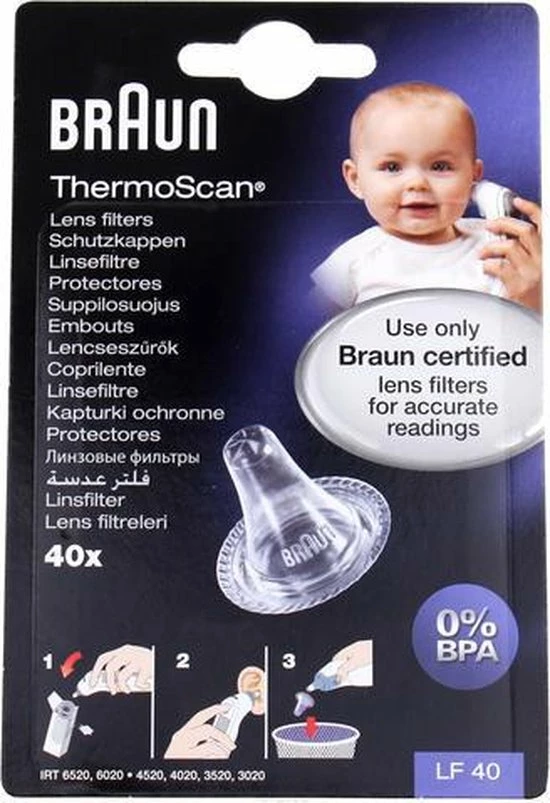 De Braun Thermoscan Lensfilters LF40 zijn veilig, hygiënisch en comfortabel te gebruiken voor kinderen en volwassenen. Met de 40 wegwerpbare lensfilters is de lens van de Thermoscan oorthermometer altijd optimaal beschermd tegen vuil en beschadigingen. Dit zorgt ervoor dat de Braun thermometer altijd nauwkeurig blijft meten. De Braun Thermocan Lensfilters LF40 Passen op alle Braun Thermoscan modellen.