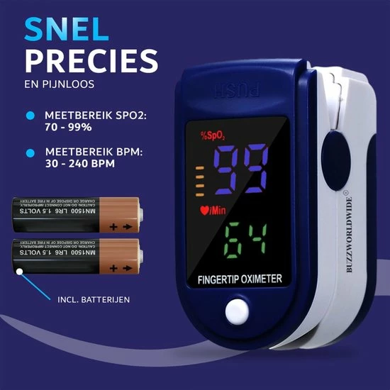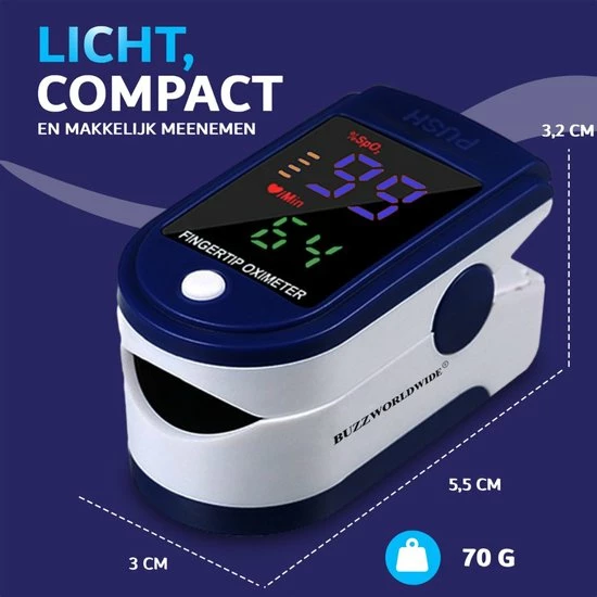 Jouw vitale functies snel, nauwkeurig en effici?nt meten kan niet eenvoudiger, dankzij de saturatiemeter van Buzzworldwide?. Bent u daarnaast een stoppende roker, corona , long-, astma-, hartpati?nt, sporter of EHBO’er? Dan is deze saturatiemeter iets voor u! Monitor uw hartslag en de saturatie nauwkeurig, eenvoudig en pijnloos. Makkelijk in gebruik en meten is weten natuurlijk!