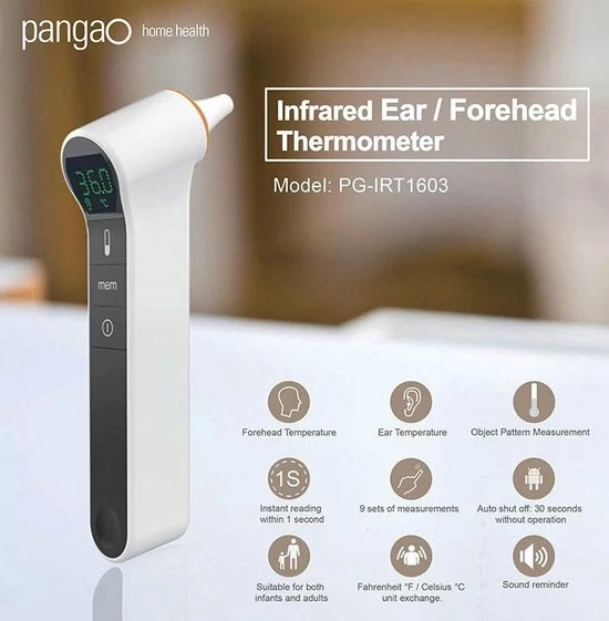 Met deze infrarood thermometer meet je accuraat, eenvoudig en zonder contact de lichaamstemperatuur af van je naasten of van jezelf. Je temperatuur lees je na minder dan een seconde af van het scherm. Op deze manier kan je zonder fysiek contact op de hoogte blijven van je temperatuur, en dus je gezondheid. Ook kan via het oor de temperatuur worden opgemeten, dankzij het meegeleverde opzetstuk.