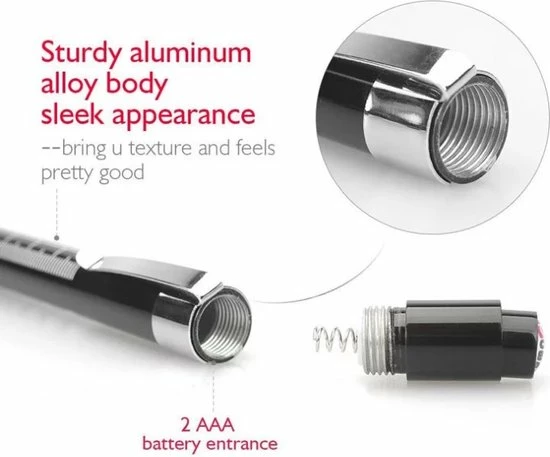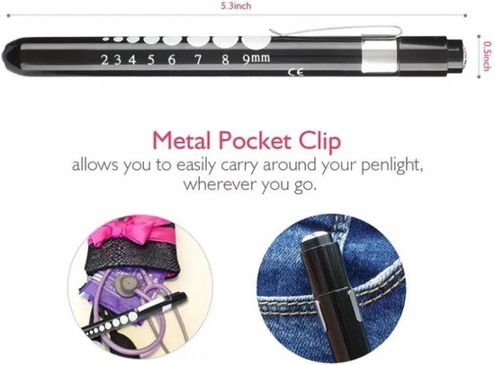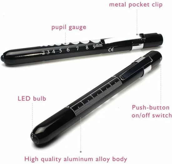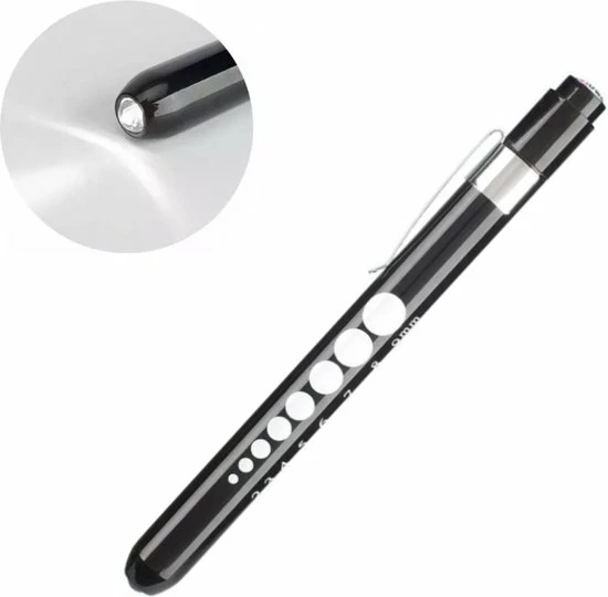 Het pupillampje is een instrument dat veel gebruikt wordt door artsen en verpleegkundigen in de medische zorg. De penlight van Jouw medische shop geeft u de mogelijkheid om snel en eenvoudig de pupilreflex te controleren. Het lampje is voorzien van 2x AAA batterijen zodat hij meteen gebruikt kan worden. De aan- en uitknop van deze zwartkleurige lamp bevindt zich aan de bovenkant. Daarnaast is er een clip aanwezig om aan bijvoorbeeld uw jas te bevestigen en is dit diagnostische lampje ook voorzien van een schaalverdeling (te zien op de afbeelding).