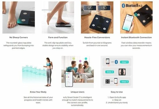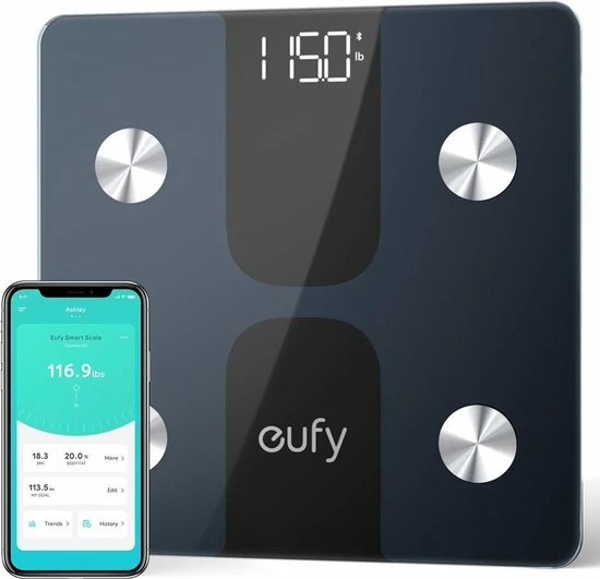 De Eufy Bodysense C1 is een slimme weegschaal. Hij meet zelf alleen je gewicht maar door de weegschaal via bluetooth te verbinden met de EufyLife app krijg je direct 12 inzichtelijke metingen van de gezondheid van je lichaam.