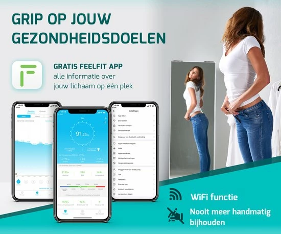 Met onze nieuwe WiFi weegschaal kan jij metingen naar je telefoon sturen zonder de app te openen. Dit is ontzettend handig wanneer je vaak metingen uitvoert, en niet elke keer zin hebt om je telefoon erbij te houden. De weegschaal stuurt de gegevens via het WiFi netwerk door naar de app, en de gegevens worden geladen op het moment dat jij de app opent. Daarnaast kan je nu ook je BMI en lichaamsvet percentage op de weegschaal zien tijdens een meting. Een absolute must-have voor iedereen die serieus bezig is met zijn gezondheidsdoelen!