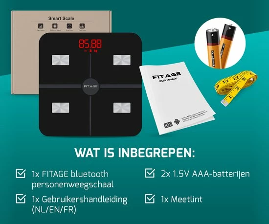 De FITAGE? WiFi personenweegschaal werkt op batterijen (2x AAA meegeleverd).