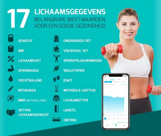 - Uitgebreide lichaamsanalyse: meet 17 verschillende lichaamsgegevens