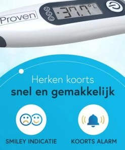 Een piepend alarm waarschuwt je wanneer de gemeten temperatuur 37.8?C of hoger is. Daarnaast laat de smiley indicatie zien wat je temperatuur betekent. Het pijltje wijst naar de blije smiley bij een gezonde temperatuur, de fronsende smiley bij verhoging en de verdrietige smiley bij koorts.