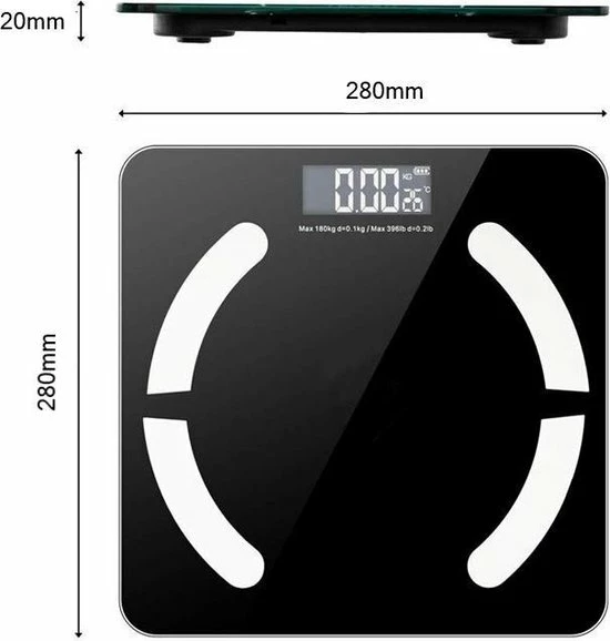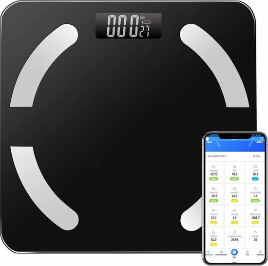 De digitale weegschaal met lichaamsanalyse meet meer dan alleen gewicht en helpt bij het creëren van een gezonde levensstijl. Deze slimme weegschaal voert een nauwkeurige 12-delige lichaamsanalyse uit en bevat onder andere een spiermassa- en een vetpercentage meter. Met behulp van de Fit App kan je de metingen zien en bewaren. Verbind de Fit App eenvoudig via bluetooth met een iOS of Android apparaat. De personenweegschaal bewaart data voor 8 gebruikers. De weegschaal heeft een weegvermogen van 180 kg en bevat anti-slip voetjes.