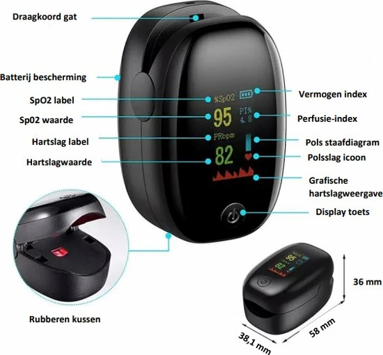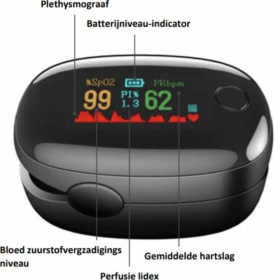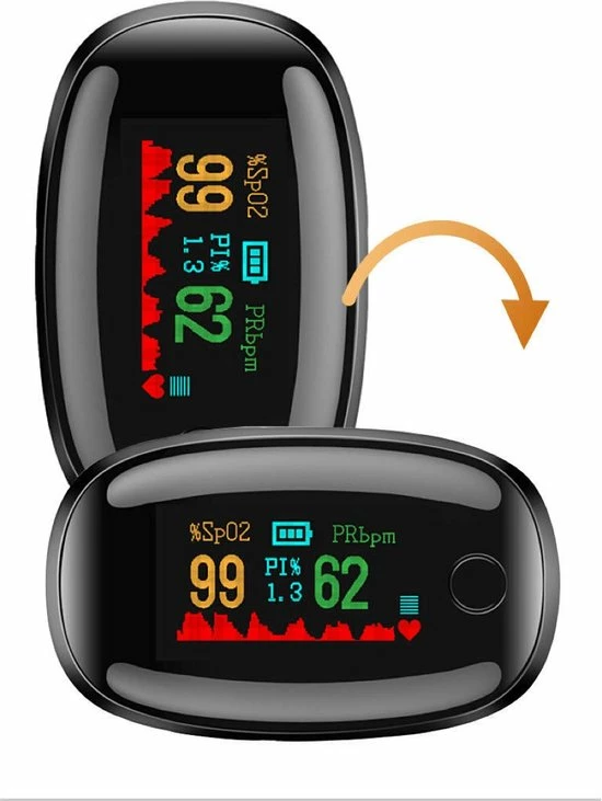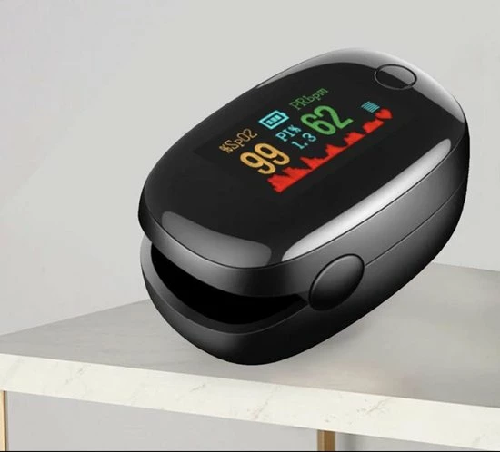 De oximeter zorgt voor de meting. Zodra je deze op je vinger plaatst, zie je binnen enkele seconden een aantal cijfers op het OLED kleurenscherm verschijnen. Deze schetsen niet alleen een nauwkeurig beeld van het zuurstofgehalte in je bloed, ze laten ook het aantal slagen zien dat je hart per minuut maakt. Daarom biedt deze ingebouwde hartslagmeter ook een uitkomst voor hart- of longpatiënten en fanatieke sporters.
