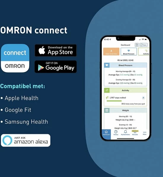 - Bekijk, bewaar en volg de voortgang van uw metingen door via bluetooth verbinding te maken met de OMRON connect-app