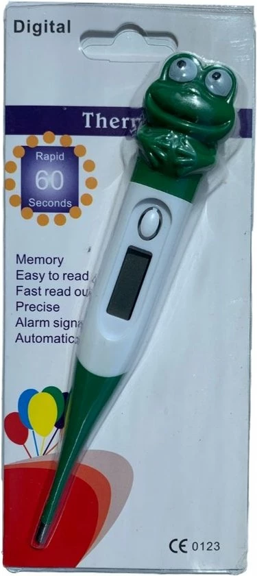 Het meten van temperatuur bij kinderen is nooit een pretje, maar kan wel leuker gemaakt worden! Deze Orange85 Thermometer Kind Flexibel Digitaal Kikker maakt het meten van de temperatuur een stuk aangenamer. Door de flexibele tip gaat het meten van de thermometer gemakkelijker. De grappige kikker maakt het voor het kind een stuk leuker. De temperatuur komt naar voren op de display met een nauwkeurigheid van 0,1?C. Daarnaast heeft deze thermometer een koortsalarm. Wanneer de temperatuur boven de 37,5 graden gemeten wordt, waarschuwt de thermometer u door middel van een aparte piep. Voor het meten van de temperatuur wordt aangeraden om de thermometer onder de oksel te plaatsen of voor rectaal gebruik. De meting duurt ongeveer 60 seconden. Met water kan de thermometer eenvoudig gereinigd worden. De thermometer gaat automatisch uit na gebruik.