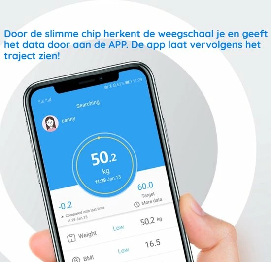 Houd je progressie nu nog gemakkelijker bij dankzij de handige en gebruiksvriendelijke app. Deze is gemakkelijk te koppelen via bluetooth, scan de QR code op de handleiding om de app te downloaden. Door de app te gebruiken heb je real time inzicht en kun je ook onderweg gemakkelijk je voortgang checken, zo krijg je een duidelijk overzicht van je behaalde resultaten. De app synchroniseert automatisch met de weegschaal en zorgt dat je altijd up-to-date blijft