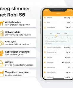 De Robi S6 is gemaakt om een uitgebreid maar vooral betrouwbaar inzicht te geven voor zowel professionals als beginners. De metingen gaan verder dan alleen gewicht door je meer bruikbare inzichten te geven dan alleen het getal dat op de weegschaal zichtbaar is. De metingen omvatten o.a. gewicht (kg, lb, st), vetpercentage, waterpercentage, gewichttrends, BMI, BMR, spier- en botmassa, etc.