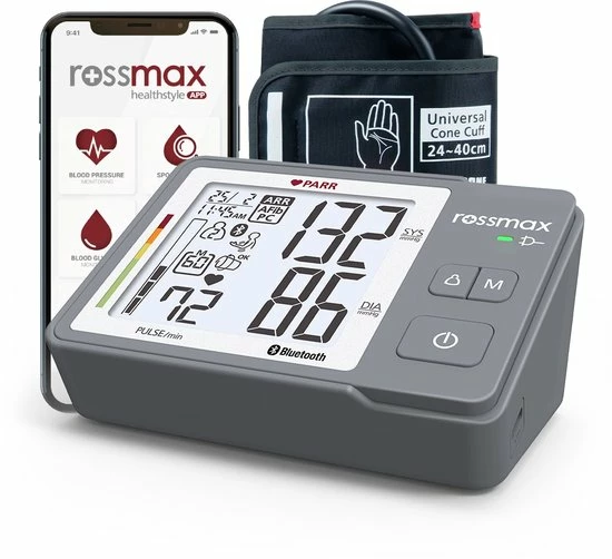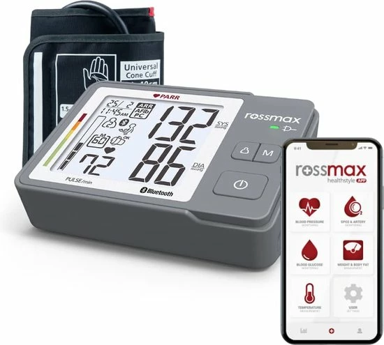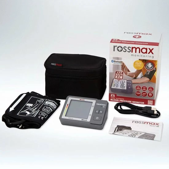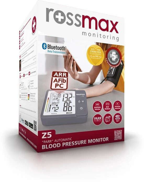 De Rossmax Z5 is een door de hartstichting aanbevolen klinisch gevalideerde bovenarm bloeddrukmeter. Deze nieuwe geavanceerde bloeddrukmeter van de Zwitserse fabrikant Rossmax is voorzien van hoogwaardige technologie, zoals o.a. ARR/AFib detectie, ARR/PC detectie en een smartphone verbinding. Met de ARR/AFib detectie kan de bloeddrukmeter signalen van boezemfibrilleren detecteren. De ARR/PC of Premature Contractie Detectie is uniek, geen enkel ander merk heeft deze technologie. Met deze detectie gaat de bloeddrukmeter na of er tijdens het meten een ?extra? hartslag is geweest. Teveel ?extra? hartslagen heeft namelijk een negatieve invloed op de werking van het hart. Met de smartphone verbinding kunt u via Bluetooth uw gemeten bloeddrukwaarden synchroniseren met de Healthstyle App van Rossmax op uw smartphone.