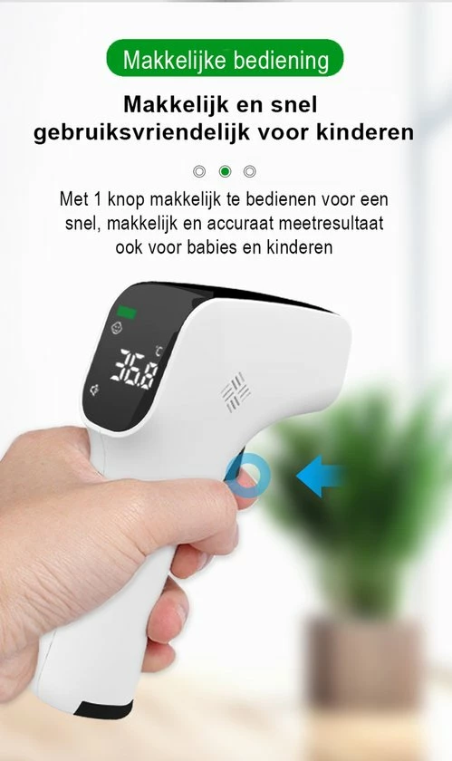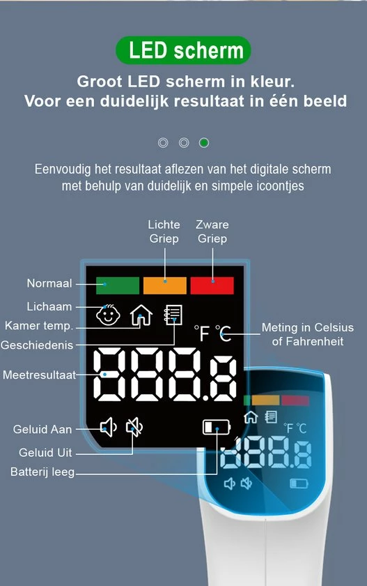 Voor een snelle, accurate en pijnloze meting van de lichaamstemperatuur van uzelf of uw familie is deze thermometer alles wat u nodig heeft. Hou de thermometer 2 centimeter van uw voorhoofd af en het digitale scherm laat u na 1 seconde zien wat uw temperatuur is, en of u koorts heeft of niet