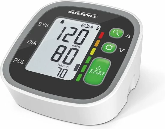 Lange termijn monitoring via de app-verbinding: na elke meting verzendt de Soehnle bovenarm bloeddrukmeter Systo Monitor Connect 300 jouw resultaten rechtstreeks naar de Soehnle Connect-app via Bluetooth?. Dagelijkse, wekelijkse, maandelijkse en jaarlijkse overzichten maken de voortgang van jouw training in ??n oogopslag zichtbaar, altijd en overal. De ge?ntegreerde bewegingssensor in de Systo Monitors Connect 300 waarschuwt je voor eventuele armbewegingen die kunnen leiden tot onjuiste metingen, wat betekent dat je altijd kunt rekenen op nauwkeurige meetresultaten. Naast de volautomatische metingen van de systolische en diastolische bloeddruk en de puls, heeft het apparaat ook een aritmiedetectie functie die een mogelijke abnormale of onregelmatige hartslag kan aangeven. Opdat je de ontwikkeling van jouw gevolgde resultaten over een langere periode kunt volgen, biedt de Systo Monitor Connect 300 elk 60 opslagplaatsen voor twee gebruikers en bepaalt ook een gemiddelde van de laatste drie metingen. In de aanvullende gastmodus kunnen andere mensen het apparaat zonder problemen gebruiken en zonder jouw metingen te negeren. Om jouw bloeddruk te beoordelen op een manier die eenvoudig en duidelijk is, worden alle meetresultaten geclassificeerd met een verkeerslichtkleurencode, volgens het classificatiesysteem van de WHO (World Health Organization).