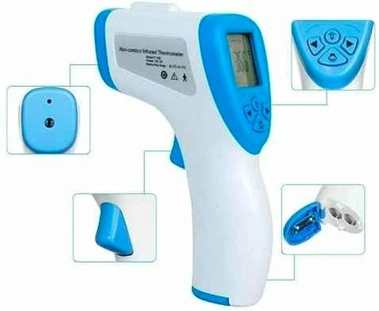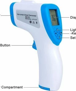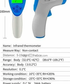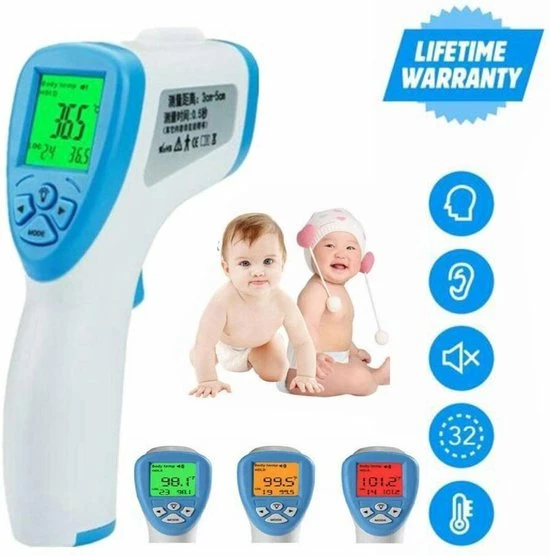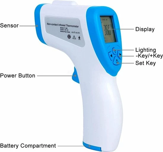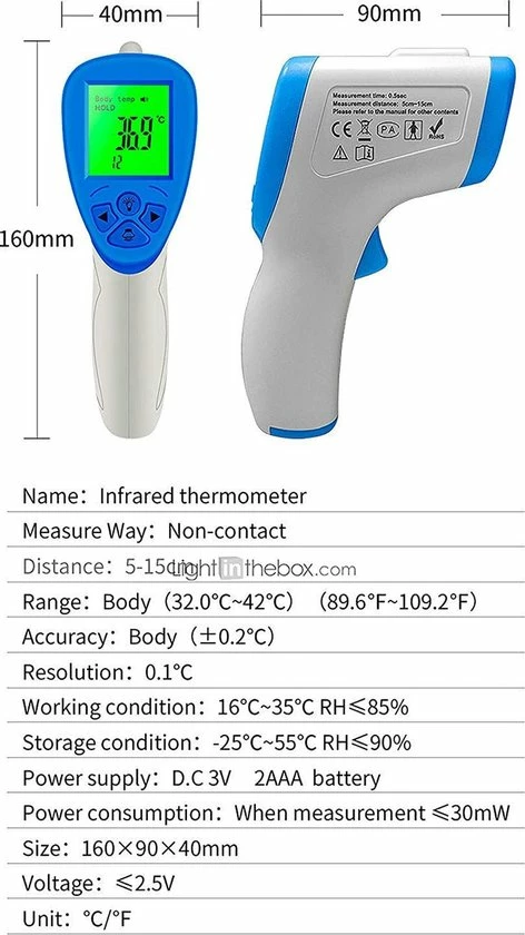 - Display: LCD kristal digitaal display, Batterij: AAA-batterij x2 (niet inbegrepen), Meetmethode: Infraroodstraling temperatuurmeting., Meetbereik: 32 ~ 42,5 ? voor menselijk lichaam, 0-100 ? voor objecten, Bediening met ??n knop 32 geheugengroepen , ? en ? schakelbaar