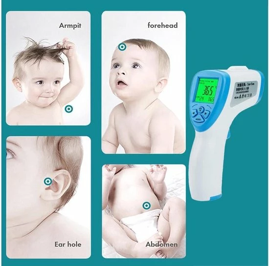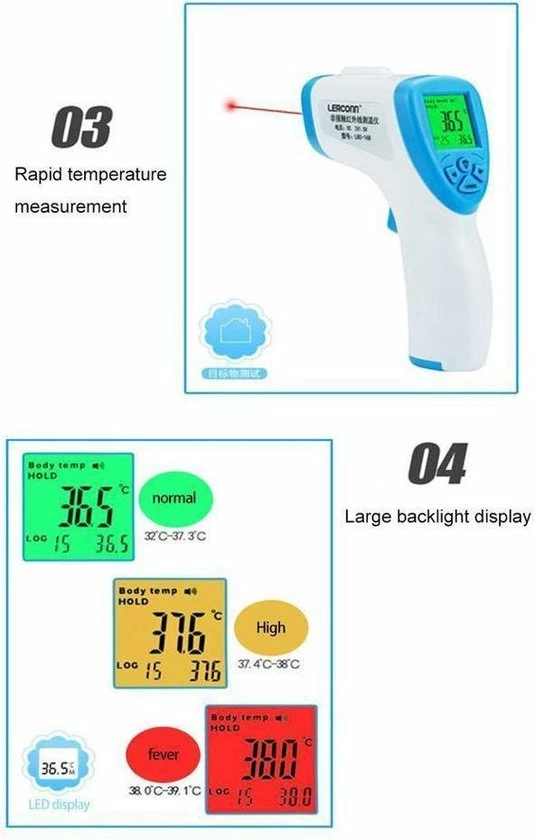 - Uitgerust met een koortswaarschuwingssysteem, geeft de thermometer voor koorts de temperatuurstatus aan met bijbehorende lampjes en pieptonen. lees het zelfs in het donker duidelijk af met een groot LCD-scherm met achtergrondverlichting, het scherm heeft ook een automatische uitschakelfunctie om de levensduur van de batterij te verlengen en is voorzien van een indicator voor een bijna lege batterij, zodat je nooit per ongeluk zonder sap komt te zitten