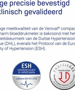 De aangetoonde hoge meetkwaliteit van de Veroval? bloeddrukmeter draagt de goedkeuring van de European Society of Hypertension (ESH).