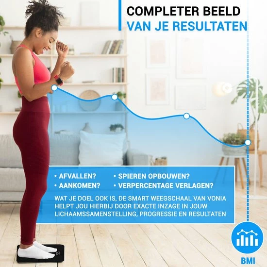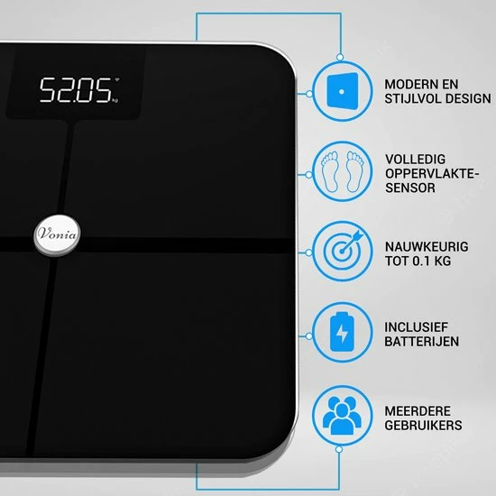 - Het ideale hulpmiddel ? Hulp en inzicht bij het behalen van jouw lichamelijke doelen is dankzij de Vonia smart weegschaal nog nooit zo makkelijk geweest. De weegschaal maakt onderscheidt tussen verschillende soorten vet, laat jouw botmassa zien, houdt het vocht in het lichaam bij en doet nog veel meer.