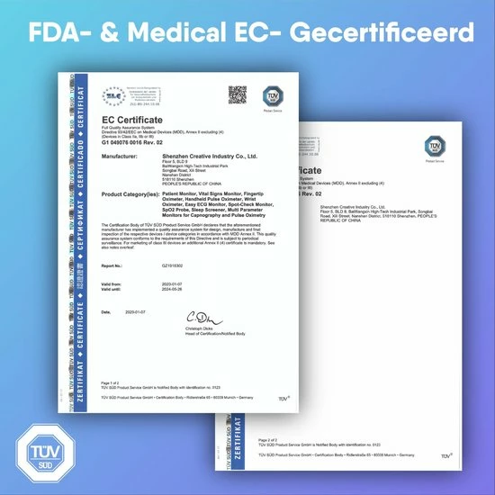 Twijfel nooit meer over de meet resultaten. Deze saturatiemeter zal jou binnen enkele seconden een duidelijk beeld gegeven op jouw saturatie (SpO2) en polsslag (bpmPR). Deze saturatiemeter heeft een EC-keurmerk. Dit betekent dat dit door de medische instanties in de EU als een accurate saturatiemeter wordt gezien.